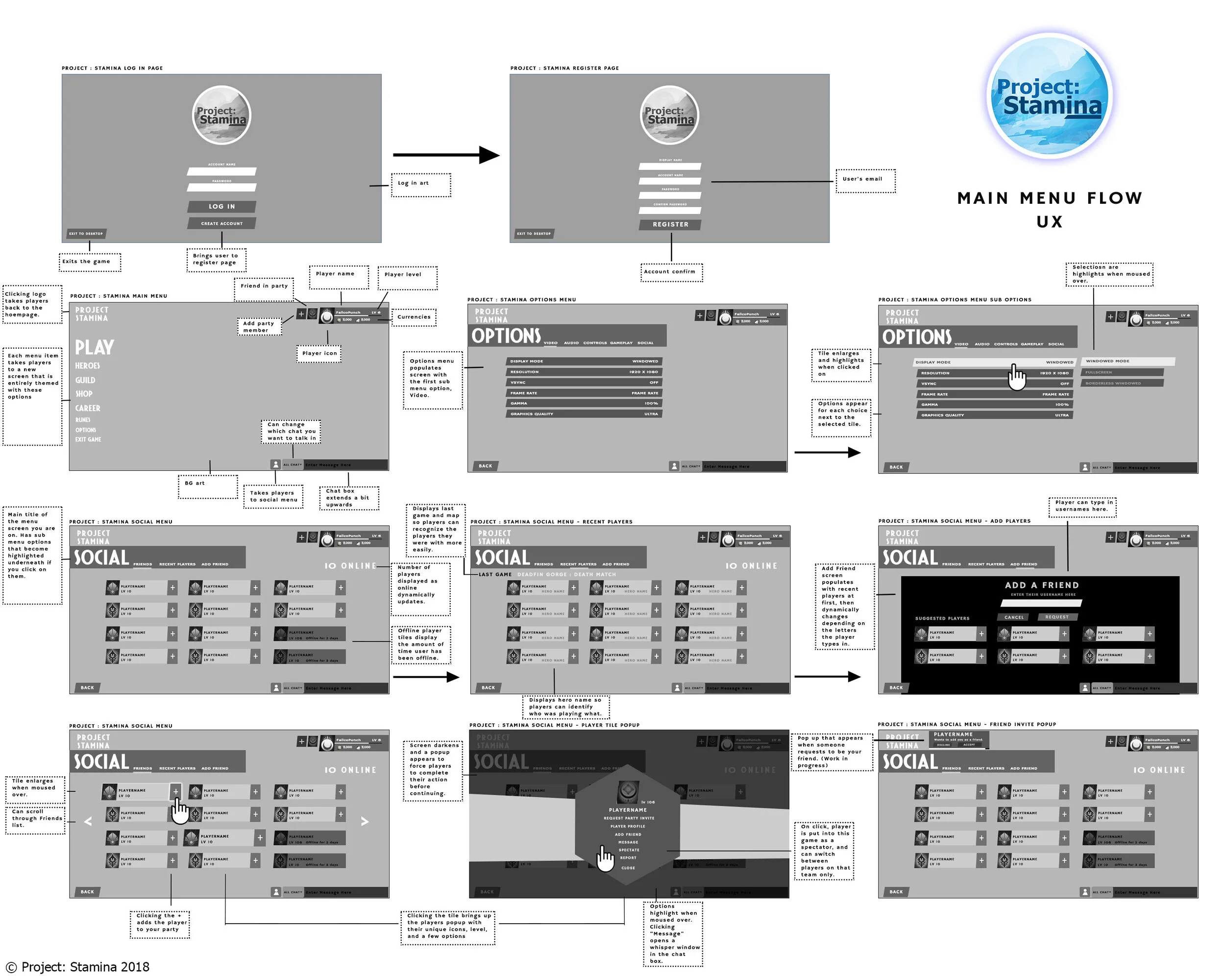 I wanted to really map out how the game flowed from one screen to the next here, focusing on the flow from logging in, to clicking on menu buttons, to ultimately viewing Options and Social screens. While this didn’t cover everything, it allowed me to dig into how items felt while hovered on, and even the popups that would appear when clicking on a player’s icon.